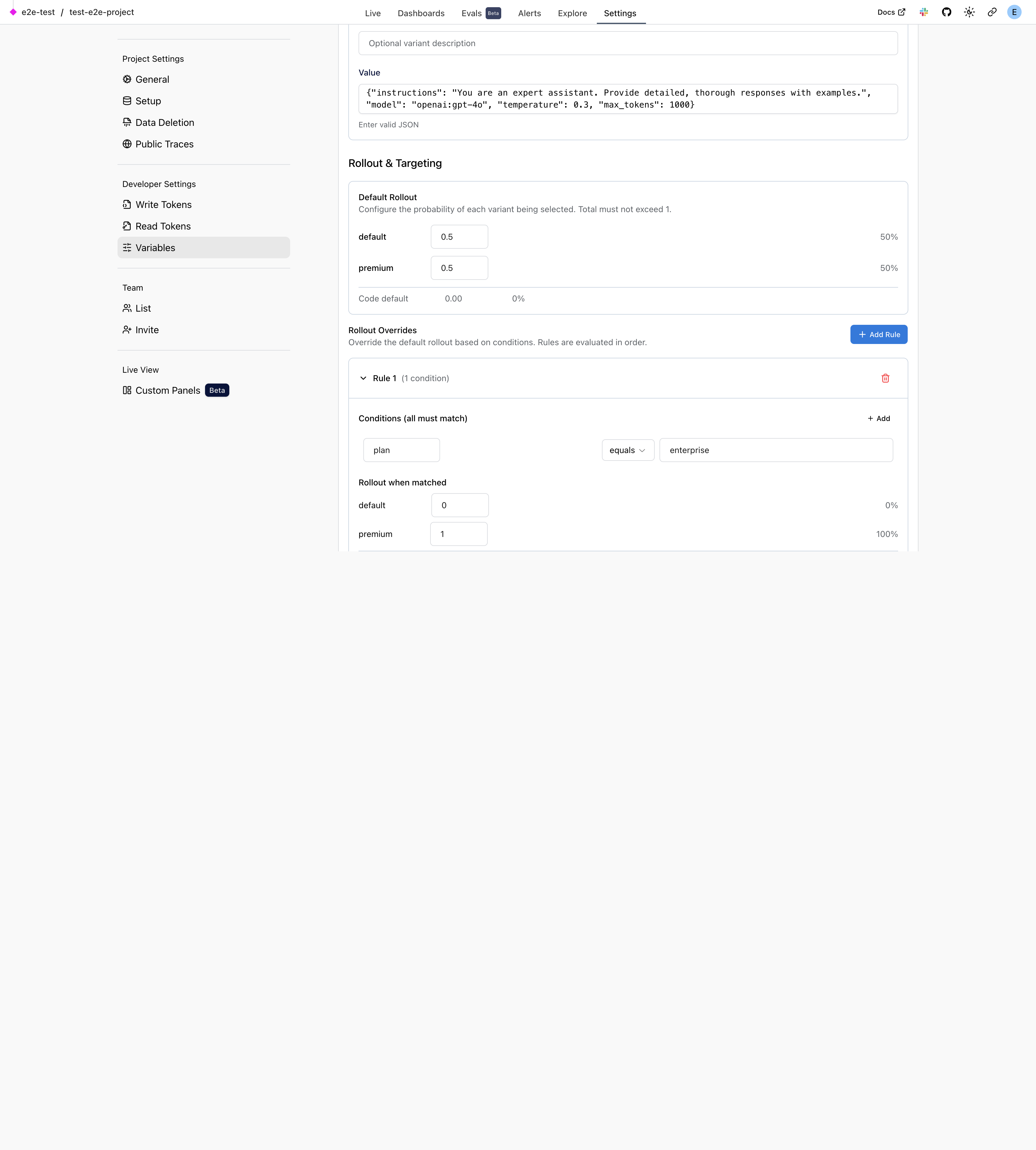 - Variants and rollouts: Define multiple values (variants) for a variable and control what percentage of requests get each variant