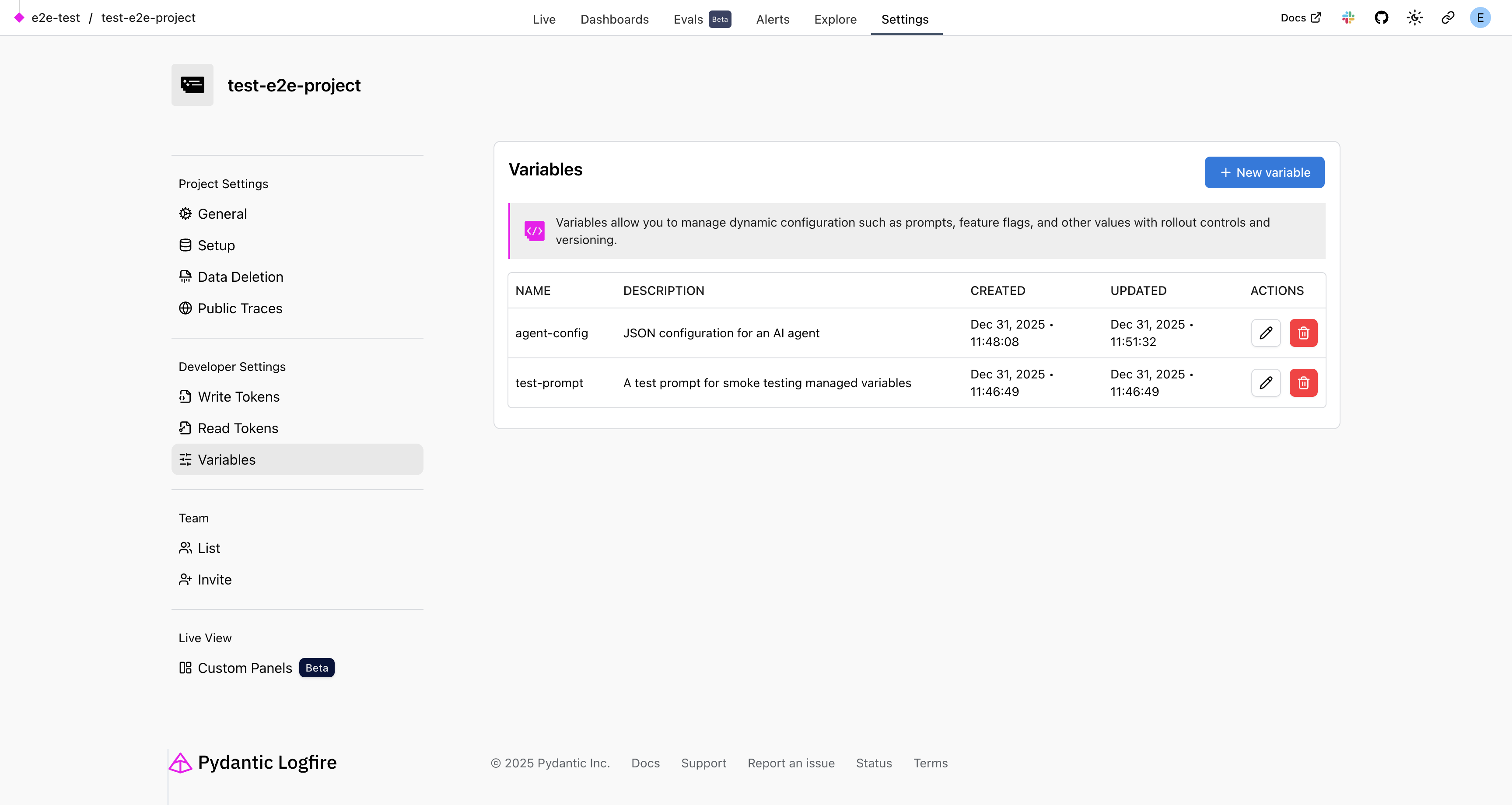The Logfire web UI provides a complete interface for managing your variables without any code changes. You can find it under Settings > Variables in your project.